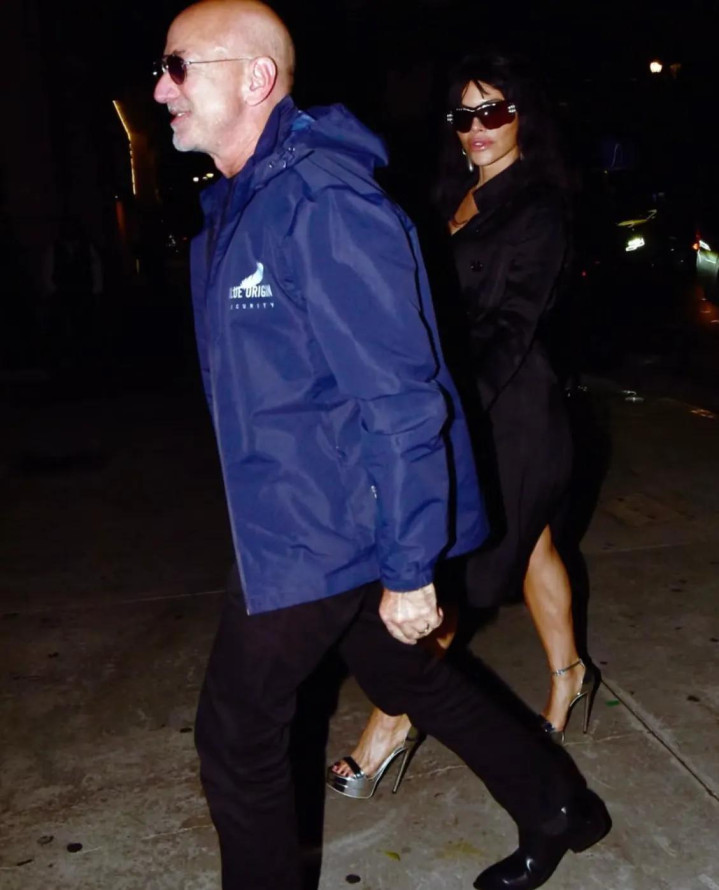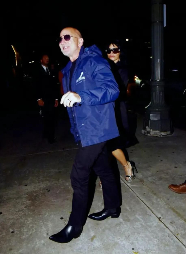 贝佐斯和桑切斯都盛装出席!贝佐斯穿着“蓝色起源”的外套来了,蓝色起源是贝佐斯创立的航空航天制造为主的公司。他穿这件外套,很符合派对主题。
