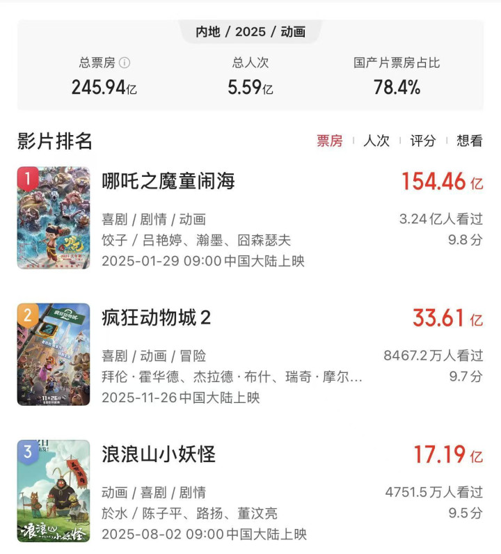 动画赛道已成为当前最明确的增量市场。据猫眼专业版,今年全国动画票房已超245亿元,占比约五成。据悉,中国电影正在推进《消失的仙人》《大圣崛起》《水浒1:风雪山神庙》《三国第一部:争洛阳》等动画项目,并探索与地方资源结合,以构建更完整的动画产业链。