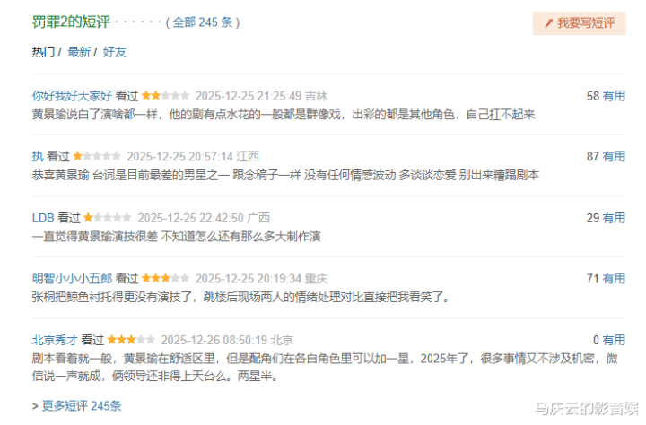 12月25日晚间,电视剧《罚罪2》在爱奇艺悄然上线,正式开启首播模式。这部电视剧由黄景瑜、王传君等演员主演,讲的则是一个架空的地域当中,犯罪分子无法无天,刑侦人员努力拼搏的故事。剧作播出之后,在豆瓣形成了近乎清一色的差评,大量差评瞄准了对于黄景瑜演技的吐槽。当然,这是一部刑侦爽剧,“爽”是重点,所以,在这个定位当中,黄景瑜其实演得不是刑侦人员,而是作为偶像明星出现的自己。