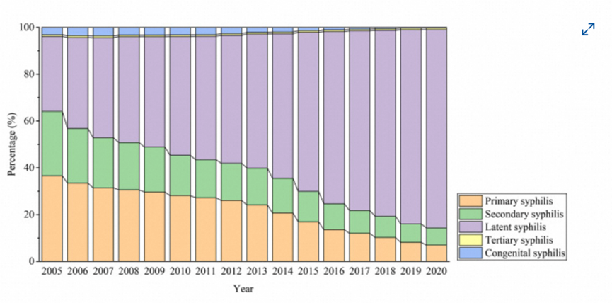 中国 2005-2020 年梅毒新发病例按症状划分的比例,其中紫色部分为潜伏期梅毒。图源:The Lancet